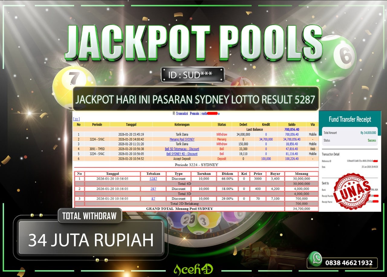 πŸ”₯πŸ”₯ JACKPOT HARI INI, SELASA 20-01-2026 πŸ”₯πŸ”₯ JACKPOT TOGEL PASARAN SYDNEY LOTTO DARI MEMBER SETIA ACEH4D πŸ’ΈπŸ’Έ